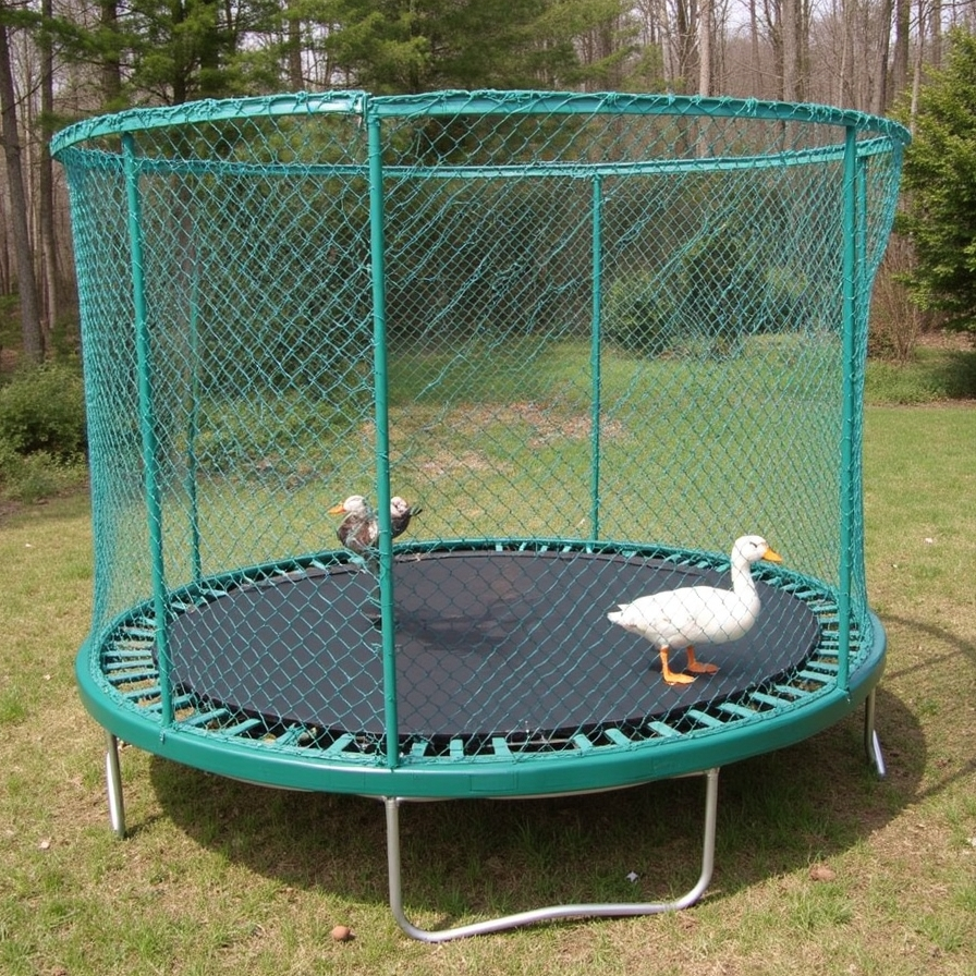 An old trampoline can be creatively converted into a duck enclosure. Begin by removing the jumping mat and safety netting, leaving the circular frame intact. This frame serves as the foundation for the new structure.