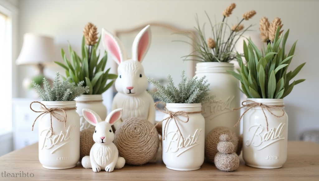 Farmhouse-style Easter décor often focuses on soft, neutral tones and simple textures. Items such as mason jars, twine, ribbon, and wooden accents can be combined to create charming seasonal decorations. Adding small bunny figures, faux greenery, or buffalo plaid ribbon helps bring the design together. These pieces look especially beautiful on mantels, dining tables, or entryway displays. Neutral farmhouse decorations are popular because they blend easily with existing home décor while still celebrating the cheerful feeling of the Easter season.