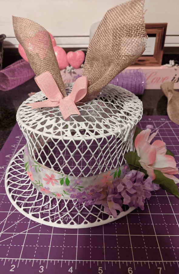 Wire baskets or small trash cans from the dollar store can become surprisingly charming Easter decorations. By turning the basket upside down and decorating it with ribbons, faux flowers, and Easter eggs, you can create a decorative bonnet-style centerpiece. The finished piece looks creative and unique, making it a fun conversation starter when guests visit. Placing the decorated basket on a mantel, shelf, or entryway table adds a playful touch to your spring décor while showcasing your crafting creativity.