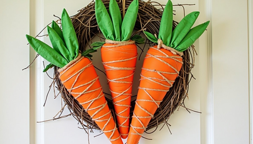 Twine-wrapped carrot decorations from the dollar store are perfect for creating charming Easter displays. These carrots can be placed inside baskets, vases, or decorative trays to add a festive touch. You can also enhance them by adding greenery, ribbon bows, or wooden signs. They look especially nice on mantels, shelves, and tiered trays. Because the carrots are lightweight and easy to arrange, they can be used in many different decorating styles, from rustic farmhouse designs to bright spring-themed arrangements.