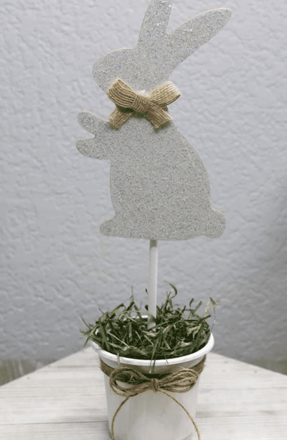 Tinsel bunny decorations from the dollar store can easily be upgraded with yarn for a softer and more stylish appearance. Wrapping the bunny shape with yarn creates a cozy texture that fits beautifully with farmhouse or rustic décor. You can choose neutral yarn colors or soft pastels to match your spring decorations. Adding a small bow, flowers, or ribbon around the neck completes the look. This simple makeover turns a basic decoration into a charming handmade accent.