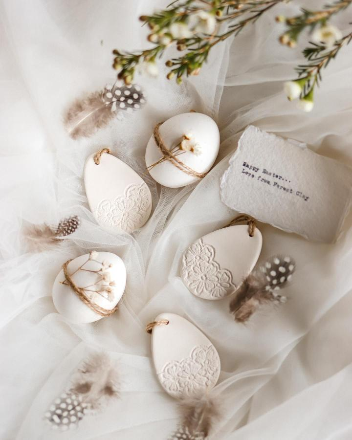 After shaping the clay into small Easter eggs, gently press lace fabric or other textured materials to create intricate patterns. Thread each tag with natural twine, and consider adding dried flowers or tiny botanical accents for a rustic yet polished look.