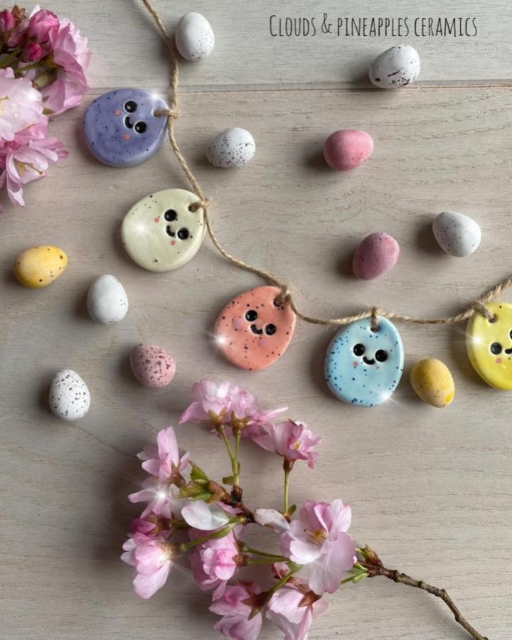 Clay eggs painted in pastel hues with cute facial expressions provide a fresh take on traditional Easter crafts. Their soft, speckled finish gives a handmade feel, and stringing them into a garland creates a playful display.