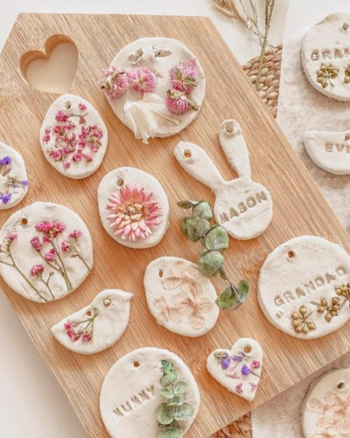 Clay tags adorned with pressed flowers bring natural beauty to Easter crafts. Air-dry clay creates a soft base for pastel blooms, which can include pinks, purples, or other seasonal colors.