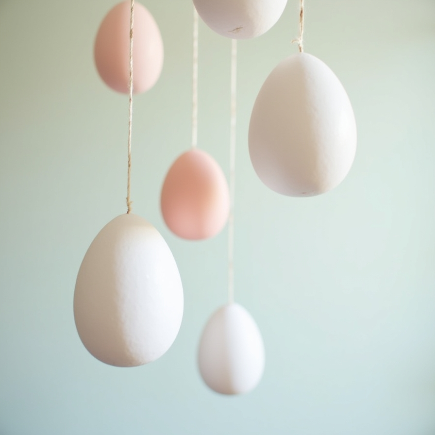 Add a magical touch to your Easter décor with hanging paper egg mobiles. Using white, soft peach, and navy-colored paper, kids can create a dreamy pastel display.