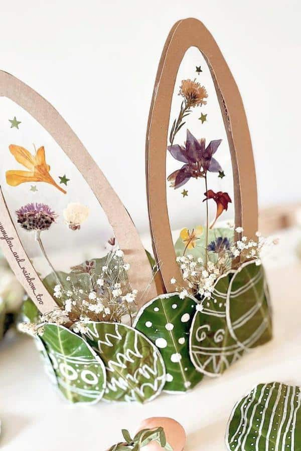 Turn cardboard into enchanting bunny ears adorned with pressed flowers. Add green leafy bases and sprinkle in doodles or gold stars for extra sparkle.