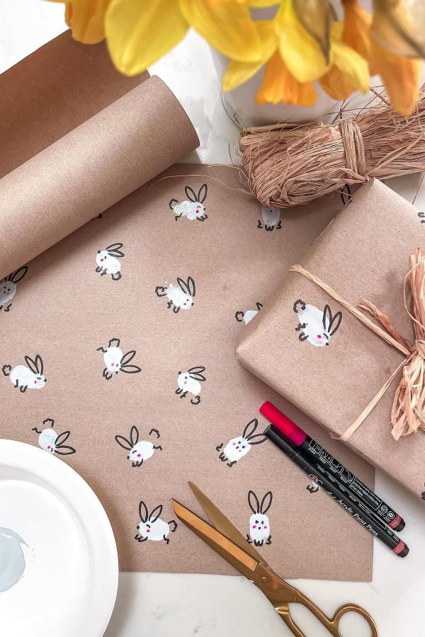 Brown kraft paper becomes playful gift wrap with hand-drawn bunny faces. Kids can decorate with pastel dots, glitter, or personalized doodles.