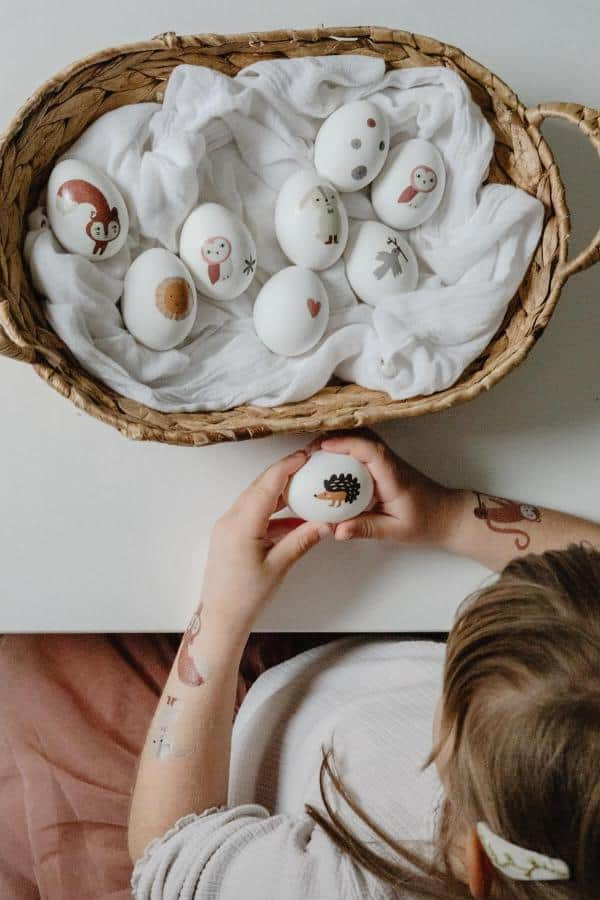 Decorate eggs with woodland animals or favorite characters using non-toxic markers or transfer tattoos. Kids can personalize each egg with pets, rainbow patterns, or nature-inspired designs.