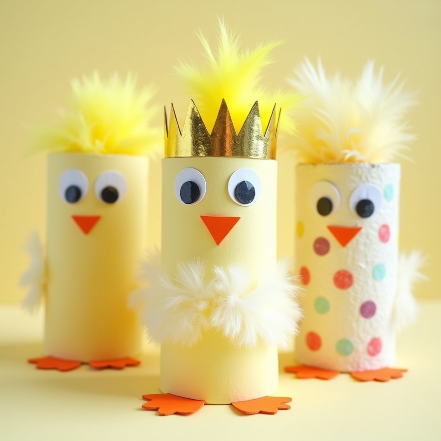 Toilet paper rolls become chicks with feathers, googly eyes, and golden crowns. Kids can decorate with pastel dots, patterns, or extra accessories.