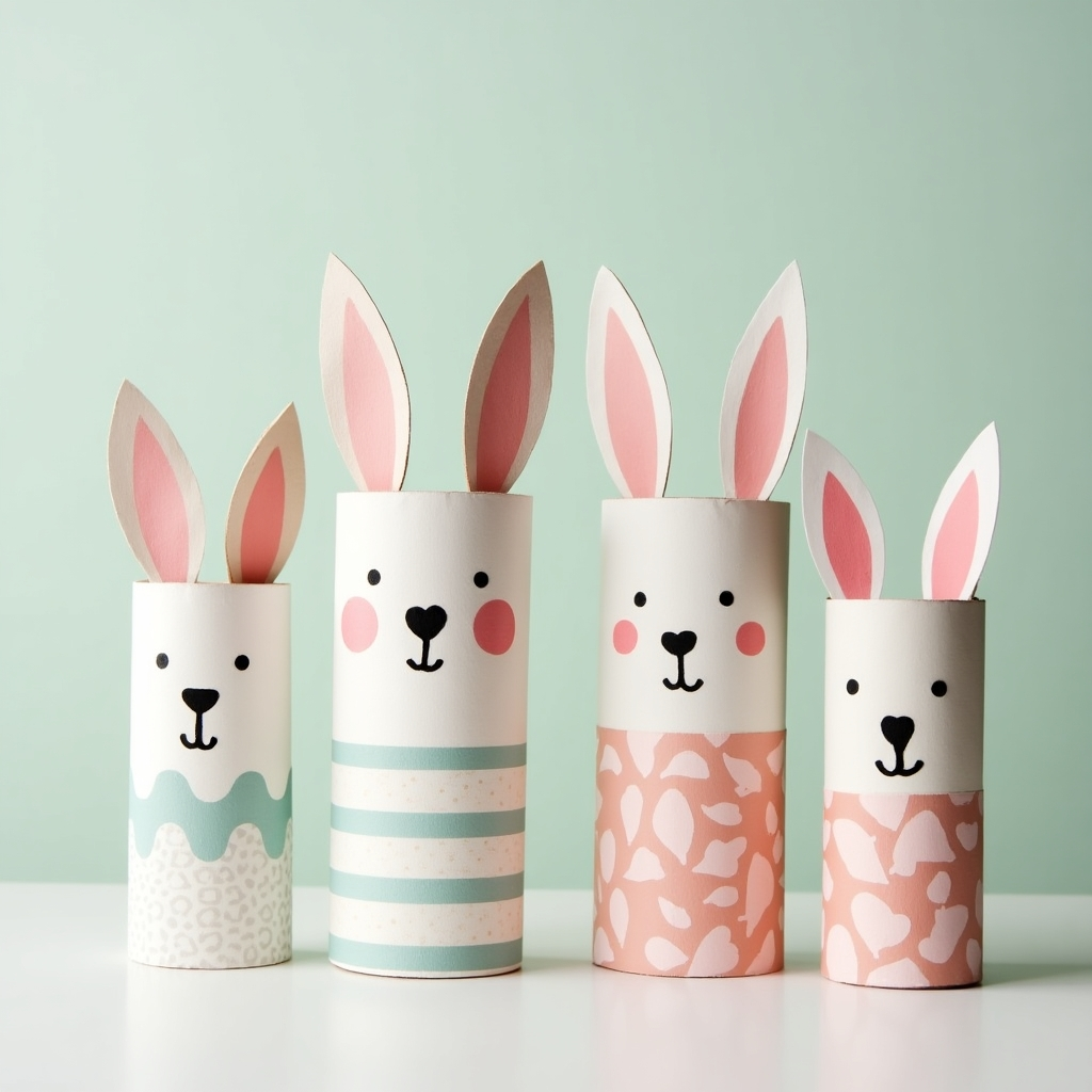Upcycling empty toilet paper rolls is an easy way to craft adorable Easter bunnies. Simply paint the rolls in soft pastels, add paper ears, and decorate with hand-drawn faces or tiny clothing details. Each bunny can have its own personality, making them perfect for a playful tabletop display or mantel décor.