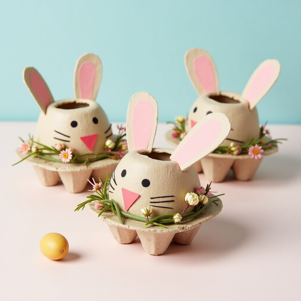 Repurpose egg cartons to make petite Easter baskets shaped like bunnies. Hand-drawn whiskers and eyes bring personality to each basket, while dried flowers glued along the edges add rustic, natural charm. A curled strip of carton can serve as a tiny handle, enhancing the handmade appeal.