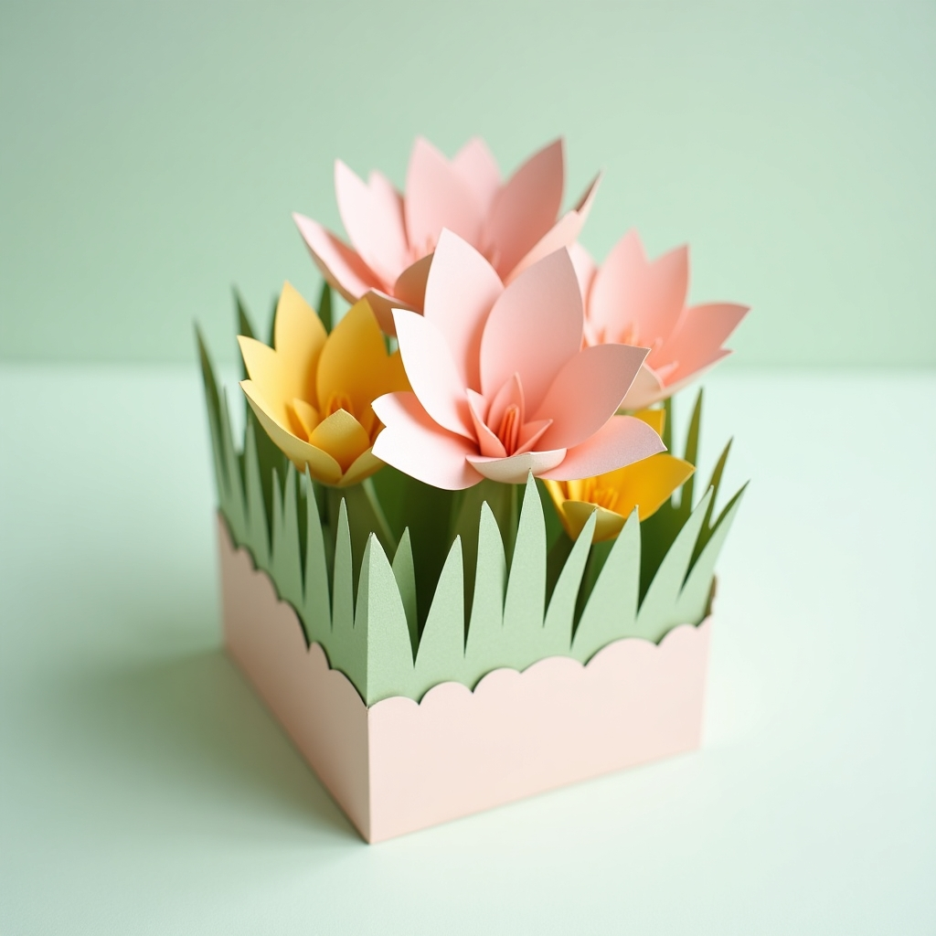 Delight friends and family with pop-up flower box cards that open to reveal a tiny paper garden. Soft pastels like pink, yellow, and muted green blend to create a spring-inspired design that feels alive and inviting.