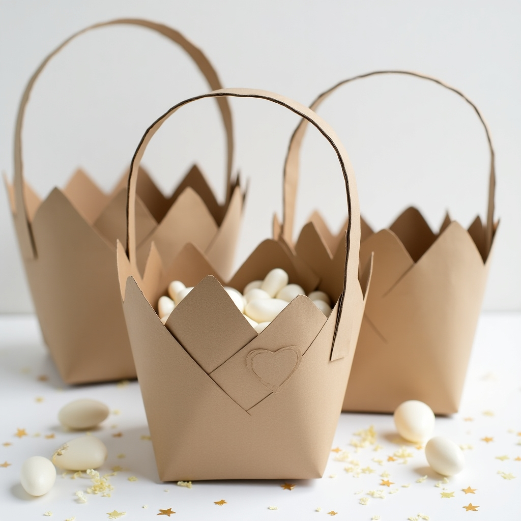 Simple kraft paper baskets exude rustic charm while remaining easy to craft. Folded edges and heart-shaped accents add a subtle decorative element, while the basket itself can hold tiny treats or decorative paper shreds.