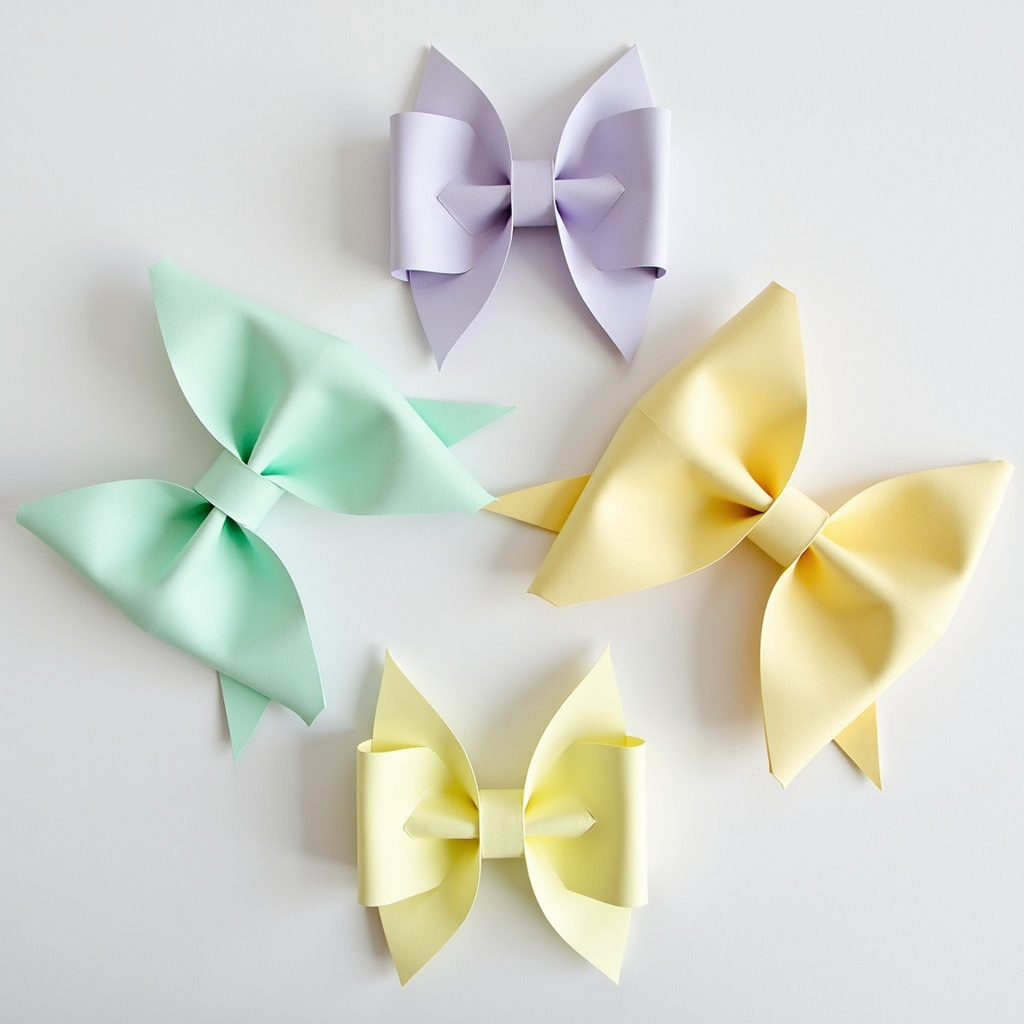 Folded pastel paper bows are simple yet striking additions to Easter crafts. Soft hues like mint green, lavender, and pale yellow evoke springtime cheer.