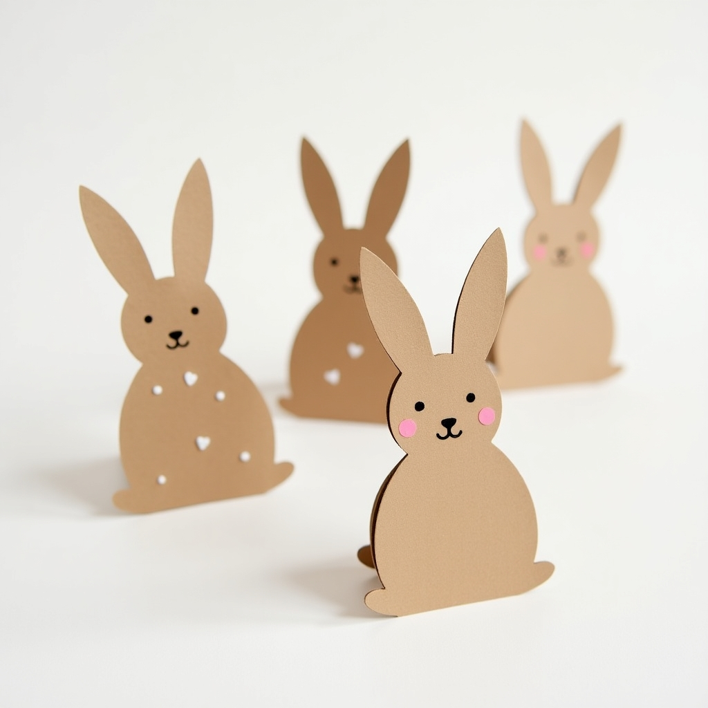Brown kraft paper bunnies with subtle blush cheeks and small white spots offer a natural, earthy aesthetic. Cut from sturdy paper, these bunnies hold their shape well and can be hung with a thin wire loop or attached to cards and gift tags.