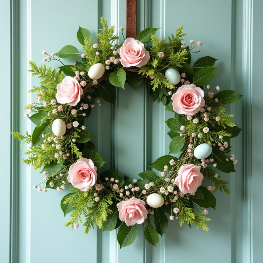 A wreath focused on greenery accented with speckled eggs offers understated elegance. Soft eucalyptus leaves provide a lush base, while artificial eggs in white or pastel tones add visual interest and seasonal charm. This combination works well for homeowners seeking a subtle, classy Easter decoration.