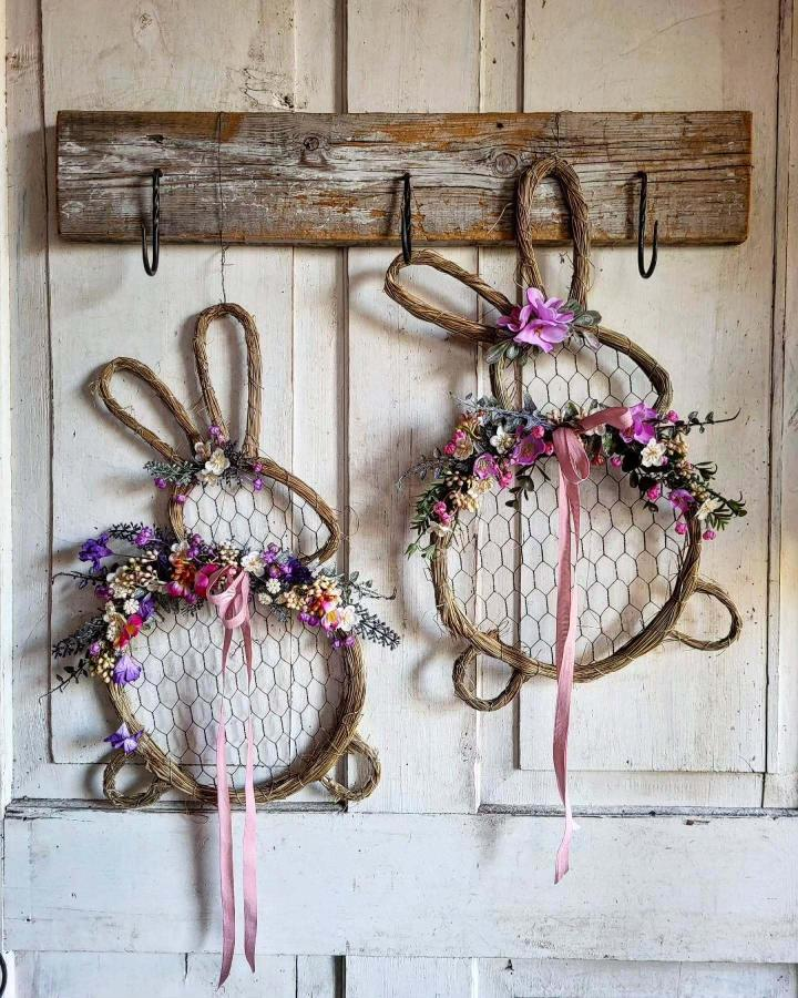 Bunny-shaped wreaths crafted from grapevine offer a playful and rustic take on Easter décor. Open frames can be accented with delicate silk flowers and long ribbons for a charming, handcrafted feel.