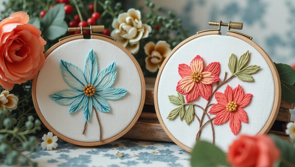 Two leafy hoop designs use stick-on patterns, so beginners can stitch without worrying about placement. Peel the adhesive, place it on the fabric, and stitch over the lines—then the backing disappears. Even slightly uneven stitches look natural in floral designs, making this technique forgiving and beginner-friendly. It’s like having training wheels for embroidery: you gain control over your needle while still creating attractive, realistic designs. The result is both satisfying and visually appealing.
