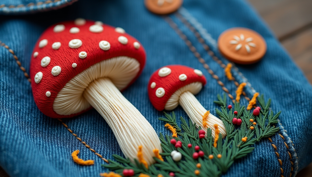 Hand-stitched mushrooms on denim show how versatile stick-on patterns can be. They guide beginners while leaving room for creative flair. Once you stitch, the backing disappears, leaving a clean finish. The process is playful and encourages experimentation, whether you’re adding a quirky design to clothing, bags, or accessories. Stick-and-stitch is perfect for new embroiderers who want to create polished results without stress, giving confidence to try bolder projects with fun, unconventional motifs.