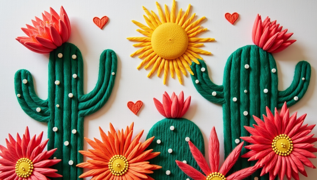 Cactus and floral designs show how freestyle embroidery can be playful and expressive. Irregular shapes and loose stitches create a unique, handcrafted look. Beginners can explore textures and stitch variety without pressure to match exact patterns. These projects are perfect for learning thread control, experimenting with motifs, and developing a personal style. The emphasis is on creativity rather than perfection, making freestyle embroidery a liberating and rewarding way to build confidence while producing visually interesting results.