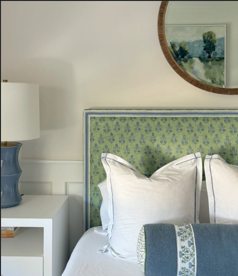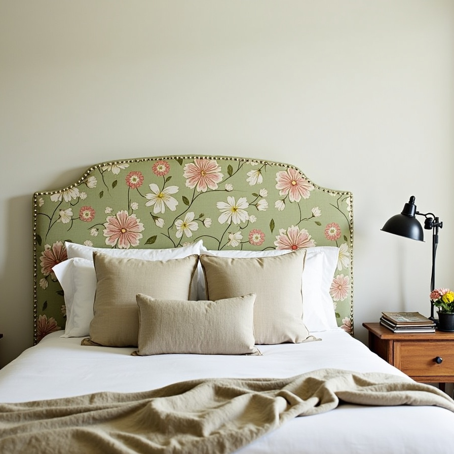 This delightful bedroom proves that a patterned fabric headboard can completely redefine a space. The soft green print evokes a peaceful garden setting, introducing a sense of freshness and calm without overwhelming the room. Its classic motif feels timeless yet slightly whimsical, striking a beautiful balance between tradition and personality.