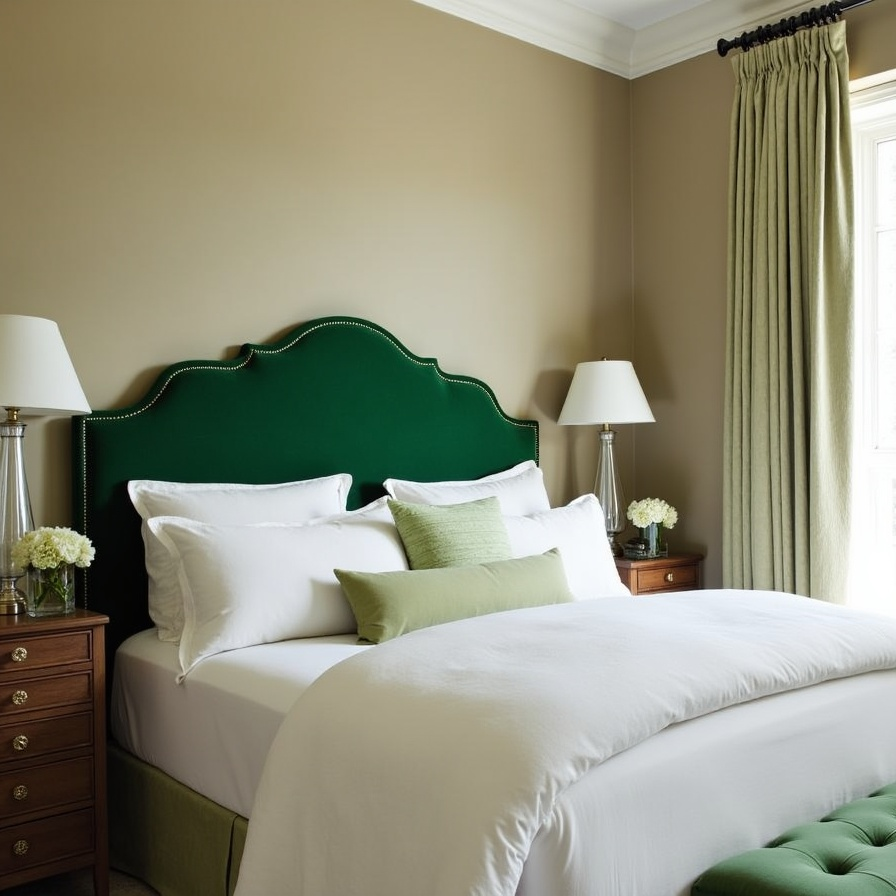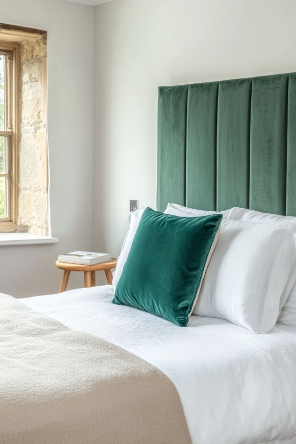 Rich green velvet instantly elevates this bedroom into a sophisticated sanctuary. The plush fabric introduces depth and warmth, creating a luxurious focal point that feels indulgent without being excessive.
