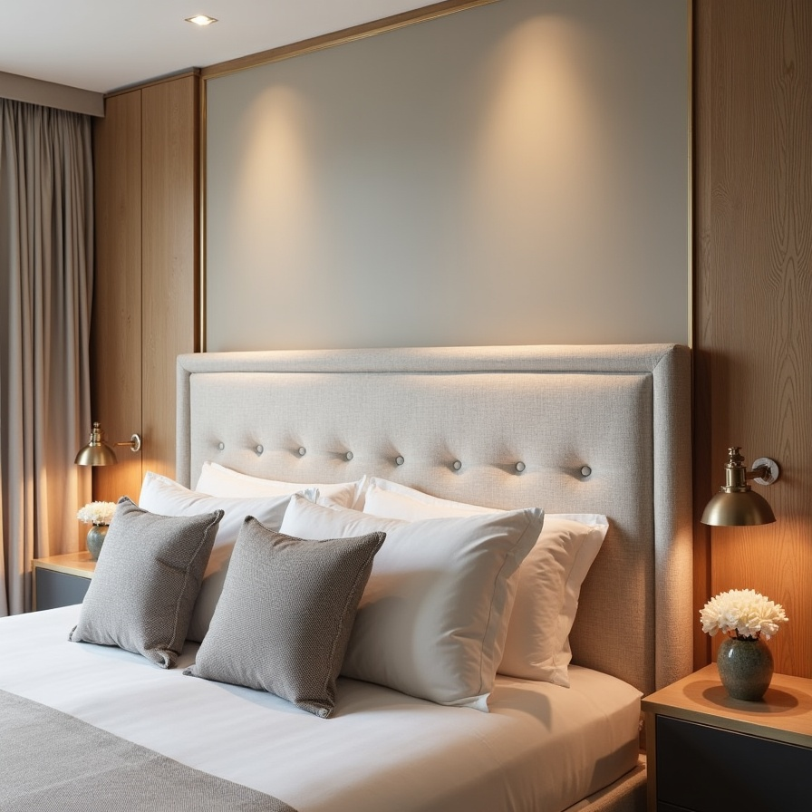 Soft neutral upholstery brings a serene elegance to this bedroom. The fabric headboard complements warm wooden accents and gentle lighting, creating a calm and inviting atmosphere.