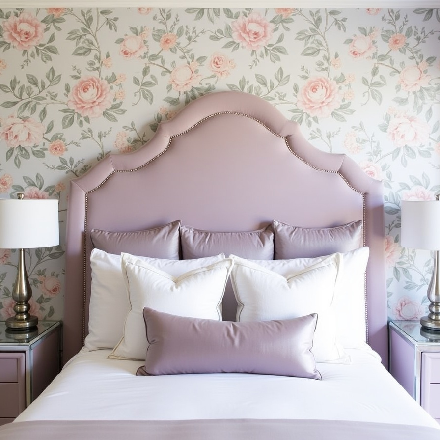 Soft lavender tones create a dreamy, romantic ambiance in this bedroom. The headboard’s unique silhouette mirrors the floral wallpaper, resulting in a cohesive and whimsical design.