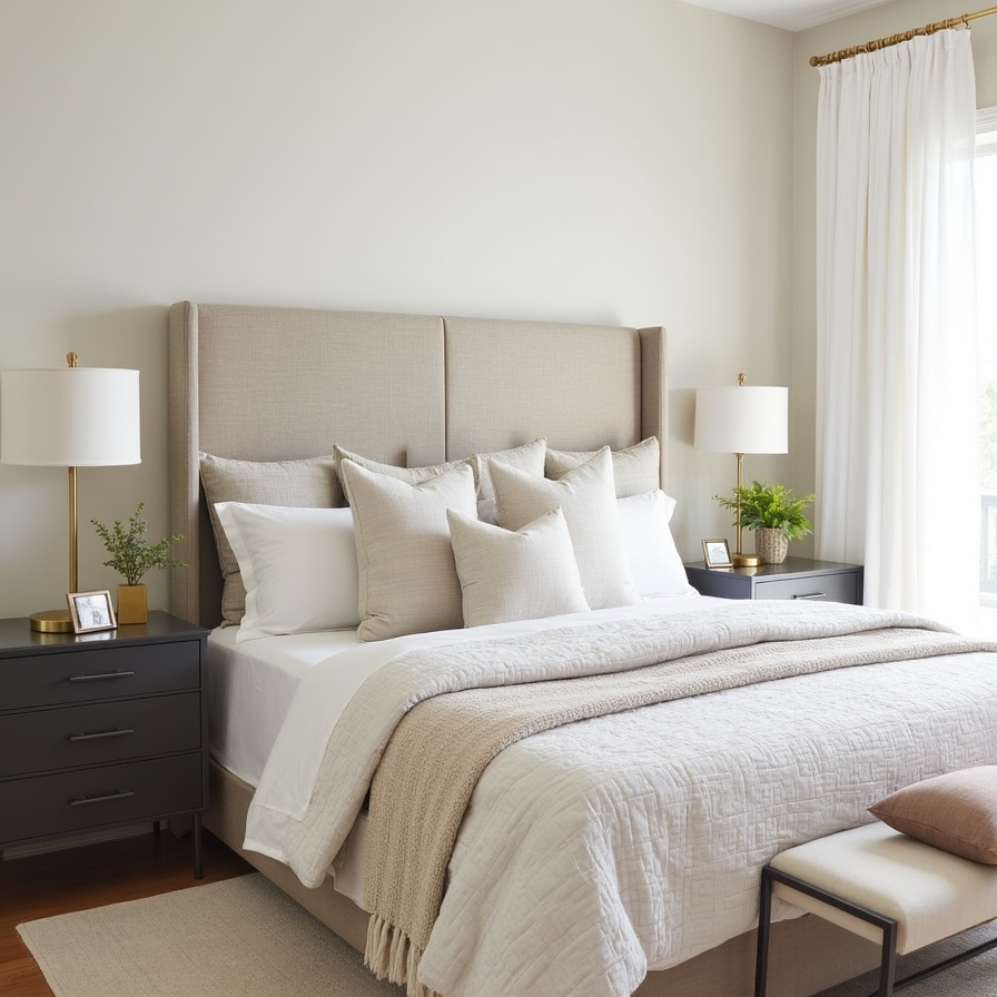 Neutral elegance defines this tranquil space. The understated fabric headboard complements wooden furnishings and flowing curtains for a harmonious look.