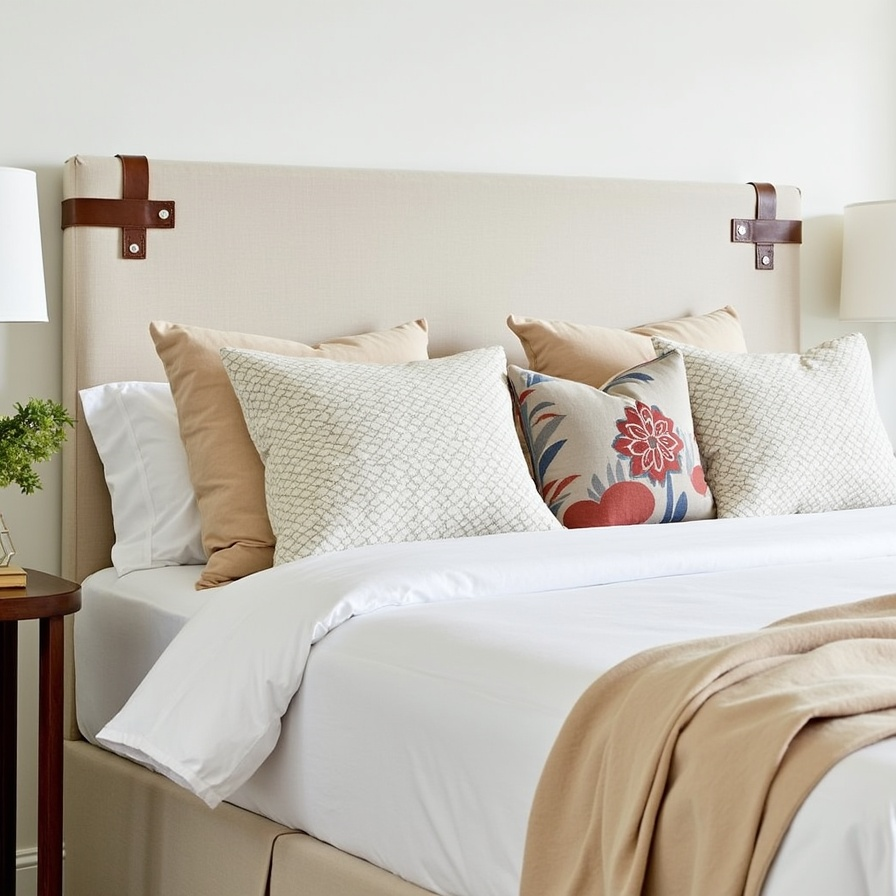 Understated yet distinctive, this headboard combines neutral upholstery with subtle leather strap details. The design bridges modern minimalism and classic charm.