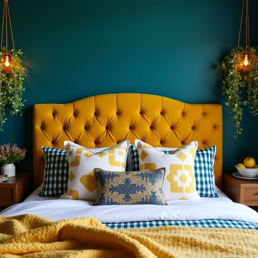 Vibrant mustard upholstery creates a captivating contrast against deep teal walls. The tufted texture introduces dimension, while patterned textiles reinforce the eclectic vibe.