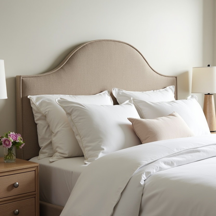 Earthy tones and crisp linens balance the rounded shape, creating a peaceful retreat. The headboard becomes both functional and decorative.