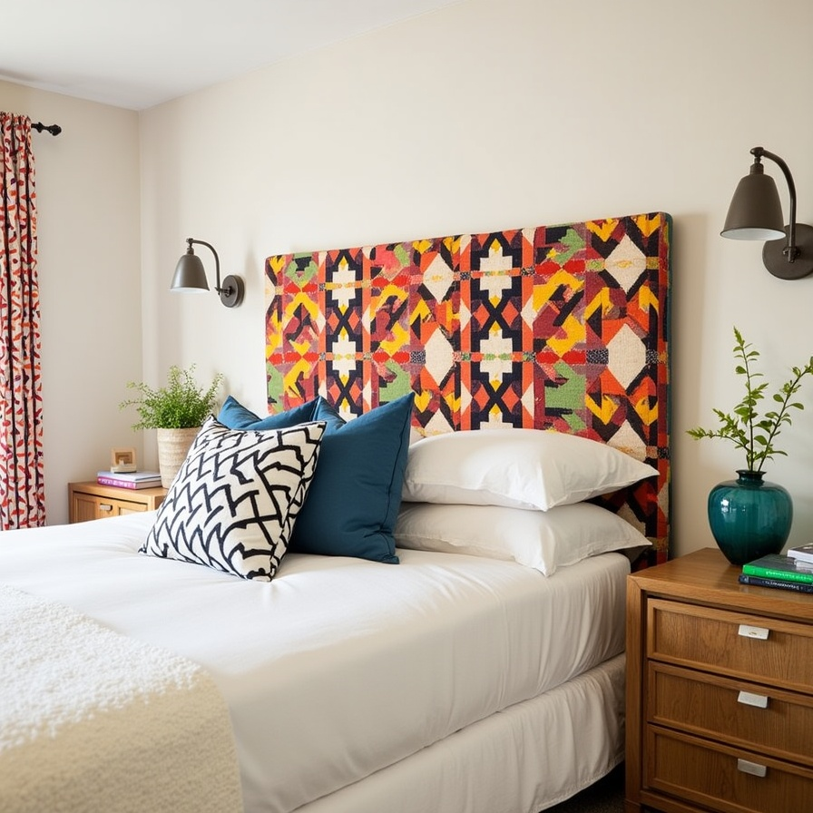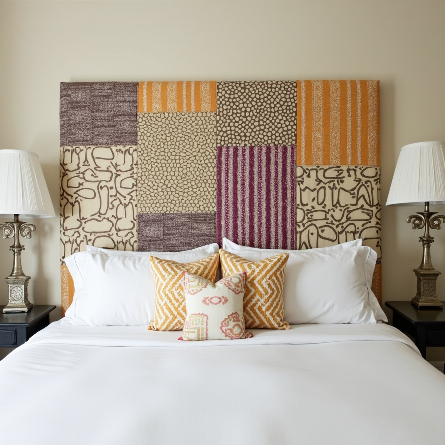 An eclectic mix of fabrics creates a headboard full of personality. Each panel contributes texture and color, resulting in a dynamic focal point.