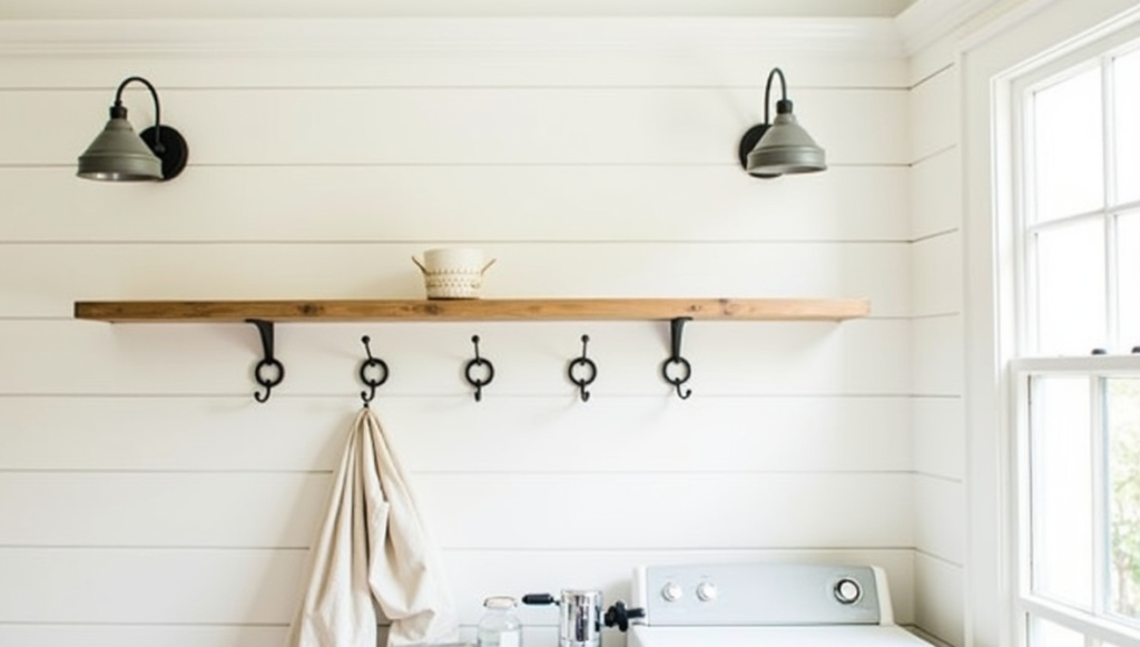 Shiplap walls aren’t limited to living rooms or kitchens—they’re perfect for creating a cozy farmhouse laundry space. A single shiplap accent wall or fully wrapped room in soft white, cream, or warm gray instantly adds texture and charm. Pairing this wall treatment with black metal hooks, vintage-style sconces, or subtle wooden shelving creates a balanced, stylish look. Shiplap helps the room feel inviting while maintaining a classic farmhouse vibe, and it also provides a durable surface that can stand up to everyday laundry activity.