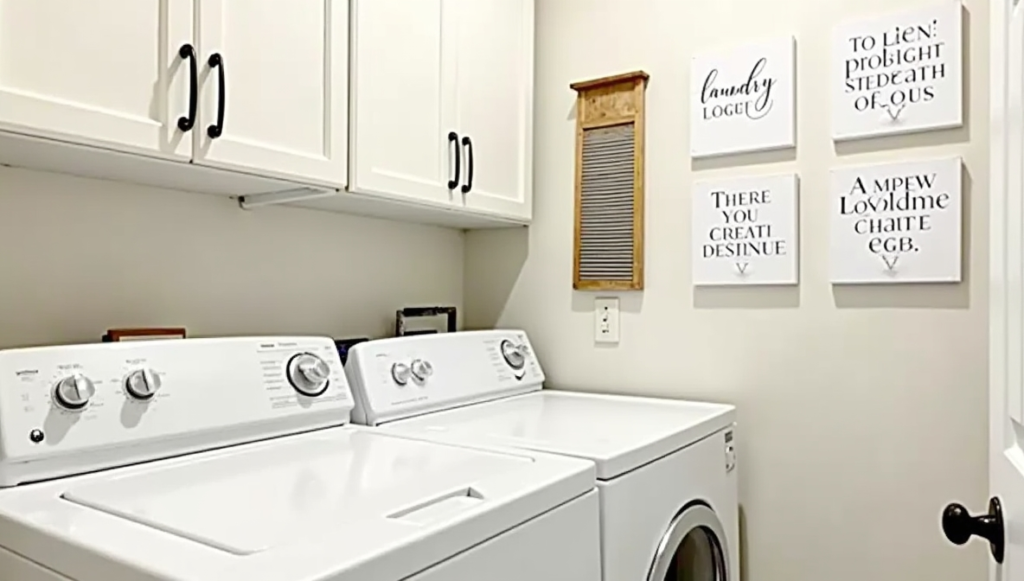 Adding small farmhouse-inspired décor elements gives a laundry room personality. Wooden “Laundry” signs, framed quotes, antique washboards, or hand-painted DIY creations bring charm and individuality. Personalized touches help the space feel curated, reflecting your home’s style. Incorporating simple crafts or rustic accessories reinforces the farmhouse theme without cluttering the room. These little details make chores feel more enjoyable and can serve as conversation pieces. A thoughtfully decorated laundry space balances function with style, making everyday routines visually pleasant and organized.