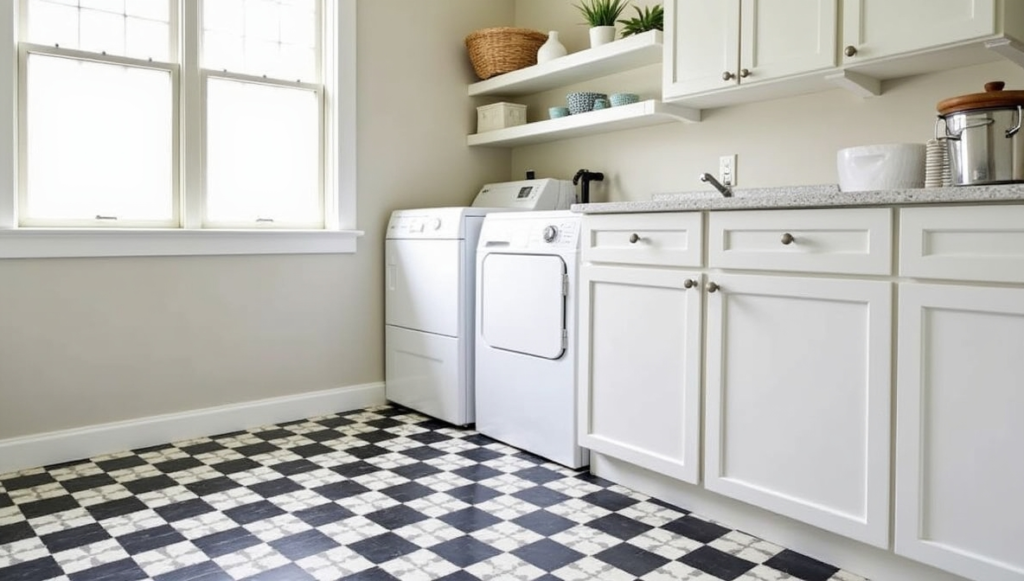 Flooring is a key element for farmhouse-inspired laundry rooms. Classic black-and-white checkerboard tiles, wood-look vinyl, or encaustic patterns add charm and durability. These options withstand daily wear while enhancing visual appeal. Coordinating patterned floors with neutral cabinetry or simple wall finishes keeps the room balanced. Choosing practical, easy-to-clean materials ensures the flooring remains functional and stylish. Patterned floors become a signature element of the space, elevating the farmhouse aesthetic while providing practicality for daily laundry tasks.