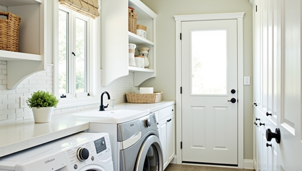 Dutch doors or half-sized sliding barn doors are excellent alternatives if a full barn door isn’t practical. They allow you to monitor the laundry room while maintaining privacy and adding a quaint farmhouse touch. Soft colors like sage green or classic white enhance their charm. Durable hardware ensures smooth operation, while maintaining a rustic aesthetic. These doors can double as a design statement, providing both functionality and visual interest, making even small laundry areas feel thoughtful and intentional.