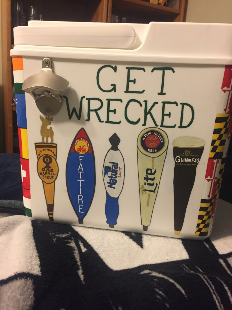 For a more playful and edgy option, the “Get Wrecked!” cooler design is perfect. This theme works well for parties where you want a bold statement piece. The concept is simple but effective: eye-catching text paired with vibrant colors ensures your cooler stands out. It’s an approachable and timeless idea that combines humor with functionality, making it a must-try for anyone looking to elevate their frat cooler game.