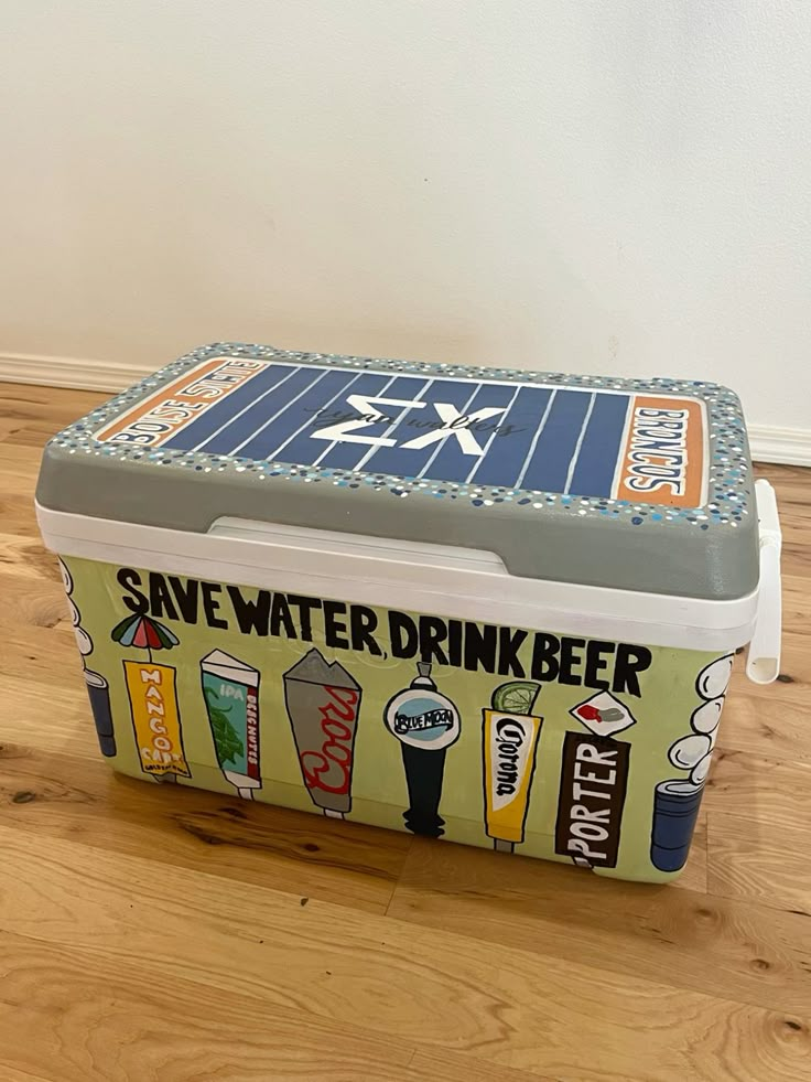 This humorous cooler design is perfect for beer enthusiasts. “Save Water and Drink Beer” combines a playful message with a practical element, turning a simple cooler into a themed centerpiece. Bold lettering and creative decoration ensure the message pops. This cooler is ideal for casual events where laughter and camaraderie are key, giving your setup personality and a fun conversation starter.