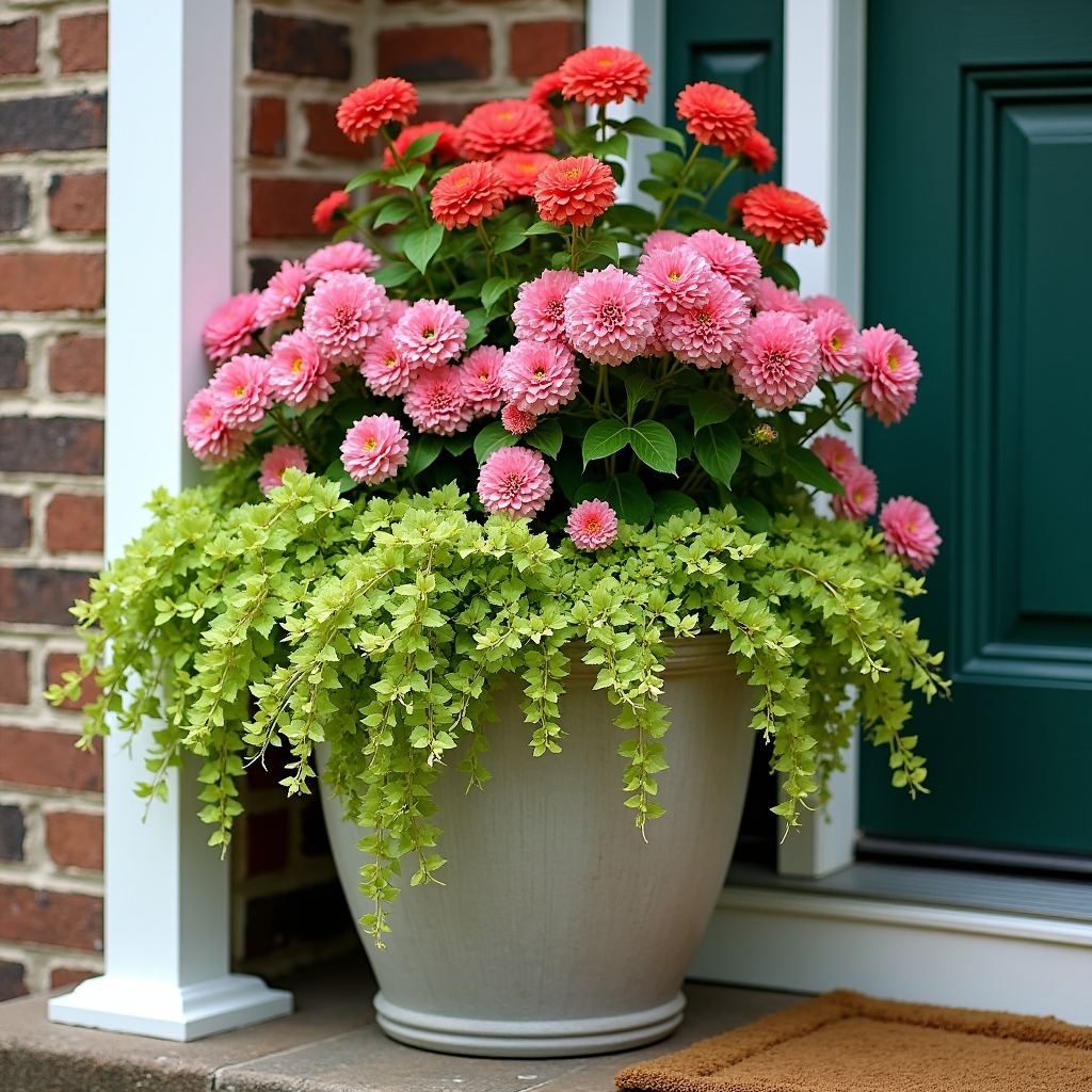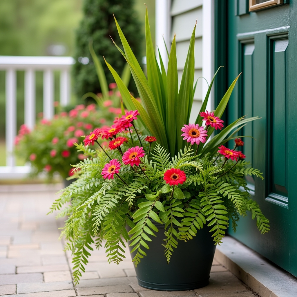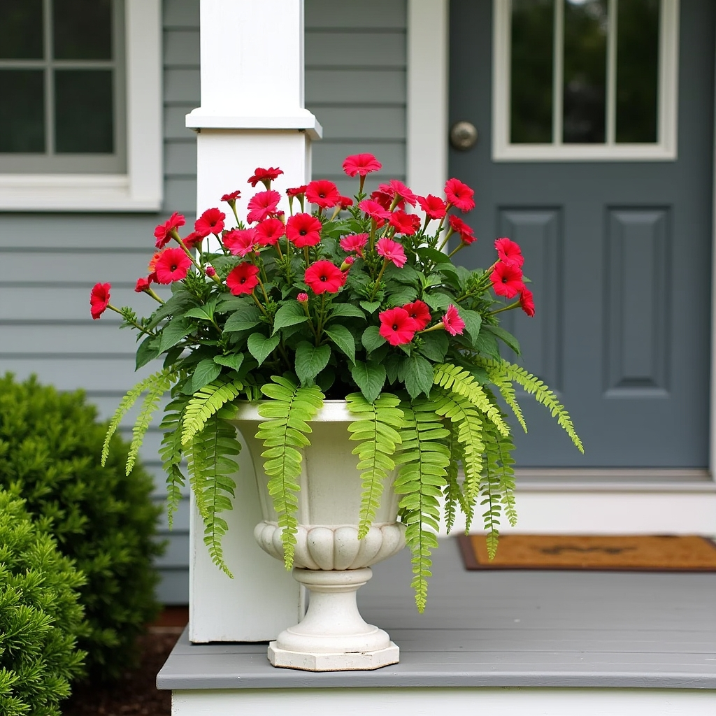 For maximum visual impact, choose a mix of bright annuals that create fullness and color contrast. Think vibrant orange marigolds, deep purple petunias, and fuchsia blooms spilling over the pot’s edge. Add taller ferns or grasses at the back to provide height and structure. The combination of dense blooms and cascading foliage makes the arrangement feel abundant and lively. Annuals also allow for seasonal updates, giving you the flexibility to change your porch’s color palette throughout the year.