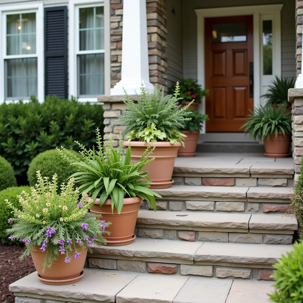 3. Grouped Flower Pots Along Porch Steps