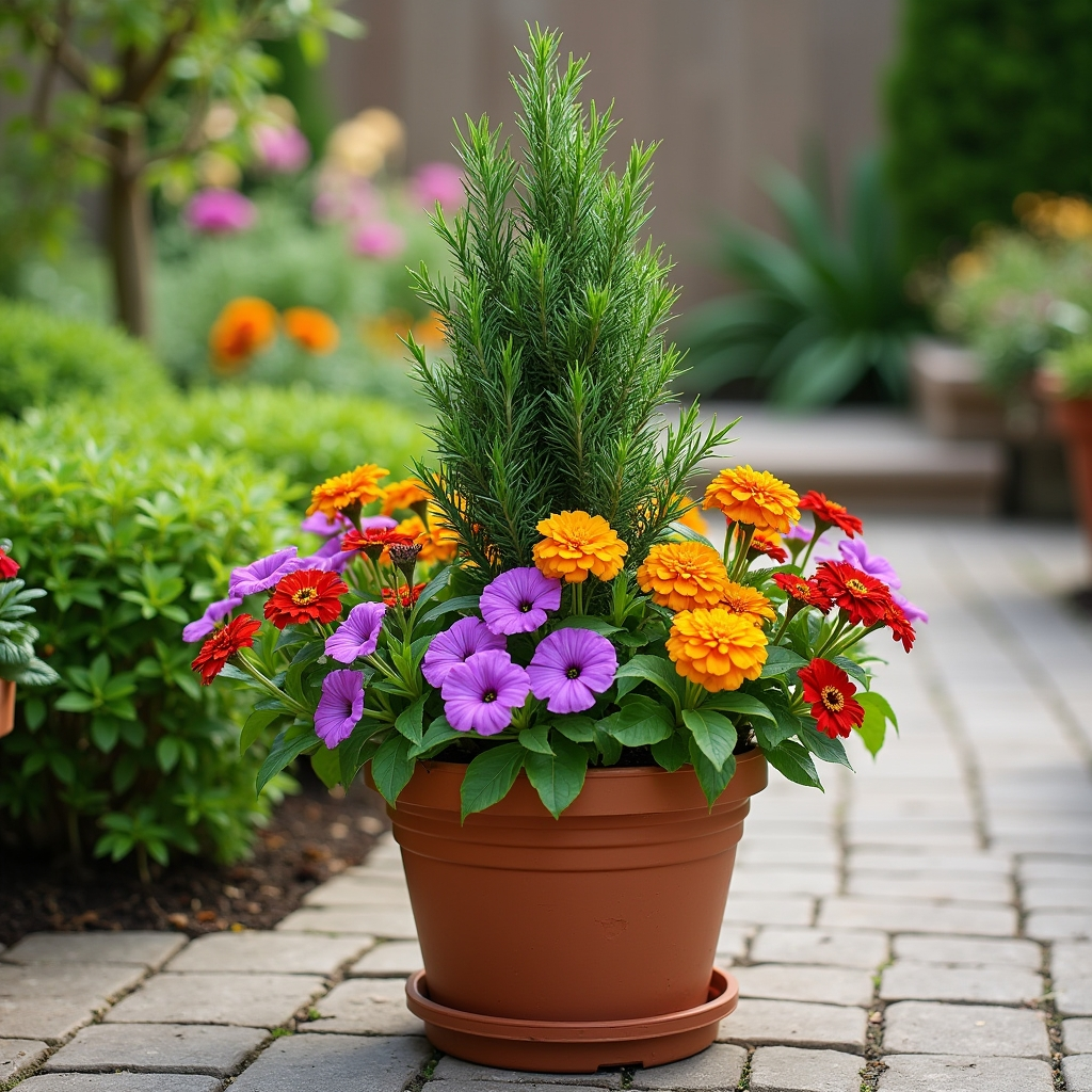 Combine beauty and utility by mixing ornamental flowers with edible herbs in a single pot. Use a vertical herb like rosemary or thyme as the centerpiece, surrounded by colorful flowers like purple petunias or marigolds around the edges. This creates a stunning visual while offering fresh ingredients for cooking. The design also encourages sensory engagement, combining texture, scent, and color. Perfect for sunny porches or patios, these mixed pots serve as a practical and beautiful addition to any home.