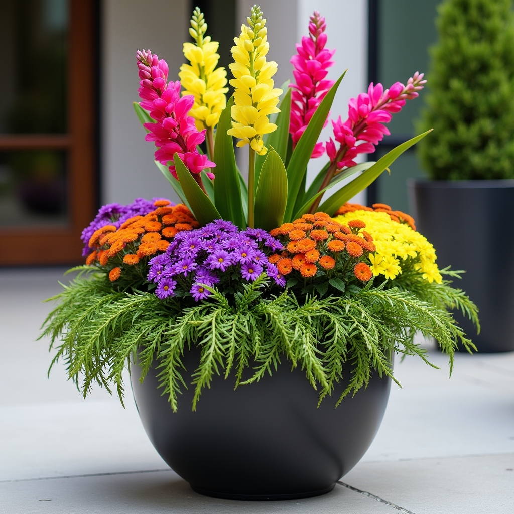 For a modern and eye-catching arrangement, select a combination of strikingly bright flowers. Neon pinks, bold yellows, and rich purples create a lively focal point. Layering tall, medium, and trailing plants ensures dimension and visual interest. Color contrast draws attention and complements contemporary home exteriors. This type of arrangement works well in urban gardens or spaces with neutral architecture, providing a splash of energy while remaining elegant and cohesive.