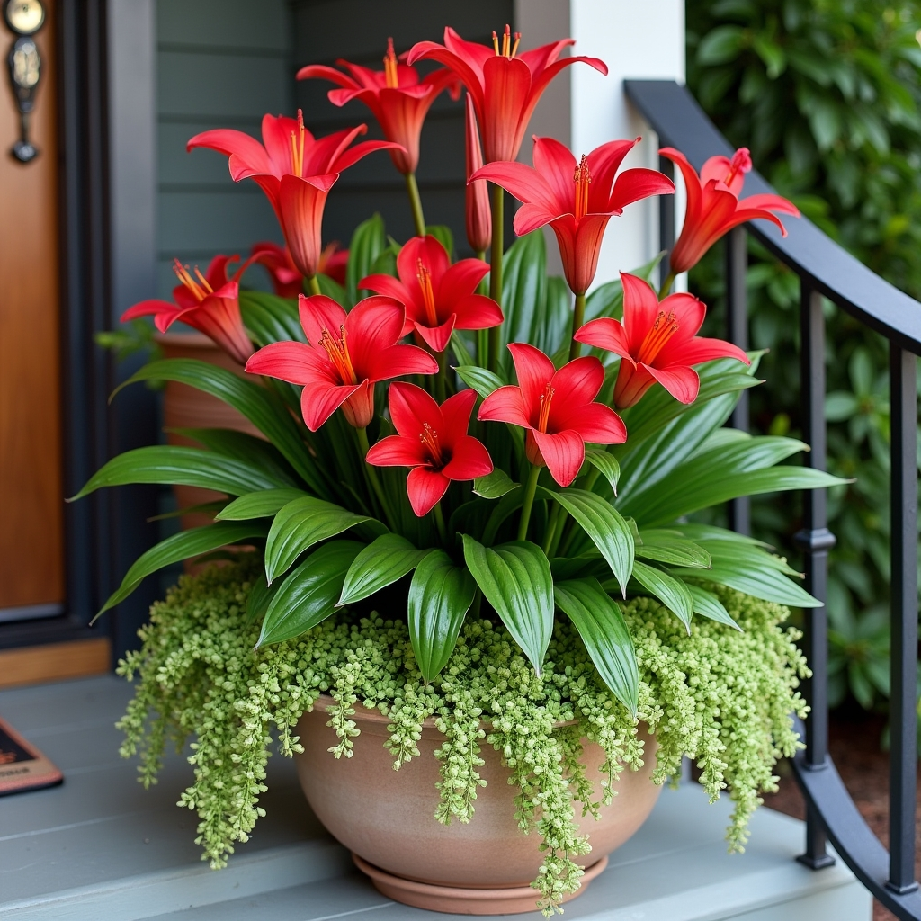Highlight stately flowers like Canna lilies in your pots to create an elegant display. Surround the central bloom with complementary foliage and trailing plants for fullness. Cannas provide height, dramatic leaves, and bold blossoms, which makes them ideal focal points for larger pots or entranceways. Their tropical appearance adds vibrancy and sophistication to your porch, while the combination of textures keeps the arrangement dynamic and visually appealing.