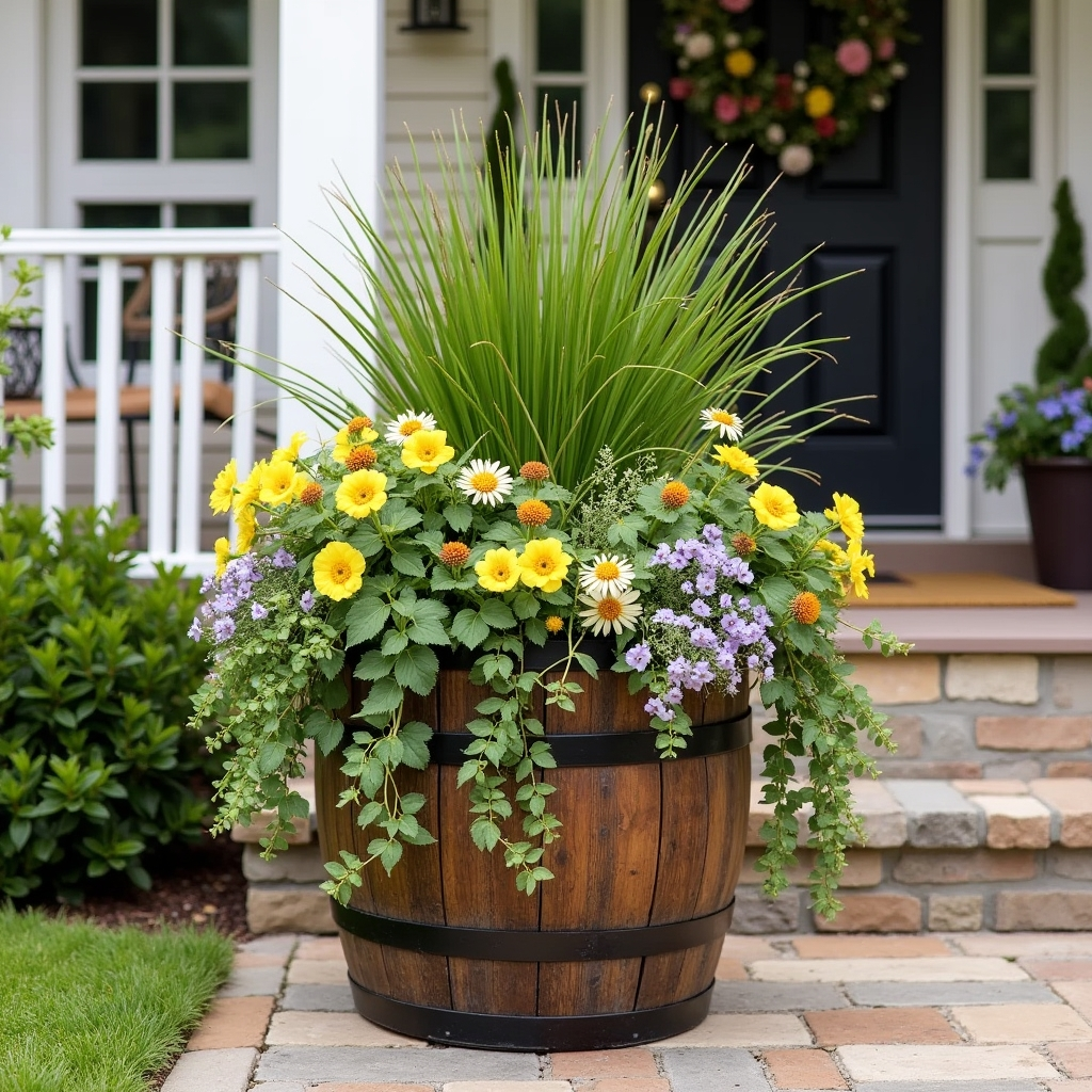 Transform a rustic whiskey barrel into a charming planter. Its deep interior allows ample space for tall grasses, cascading vines, and dense blooms. Perfect for large porches, the barrel adds height and structure, making your plants the main focus. Layer flowers and trailing plants to create a full, overflowing look. This farmhouse-inspired idea is both practical and decorative, providing a statement piece while maximizing planting capacity.