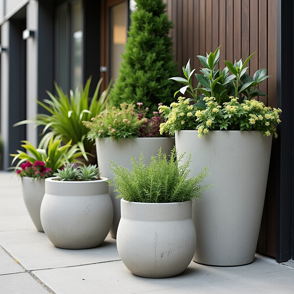 Cement planters offer durability and a modern, industrial look. Group varying shapes and sizes together to create visual contrast. These pots are ideal for urban settings or contemporary porches, blending sturdiness with design appeal. Cement’s neutral tones complement colorful plants while ensuring the containers remain a long-lasting investment. Their weight makes them stable in wind or rain, allowing for robust, secure displays that are low maintenance yet striking.