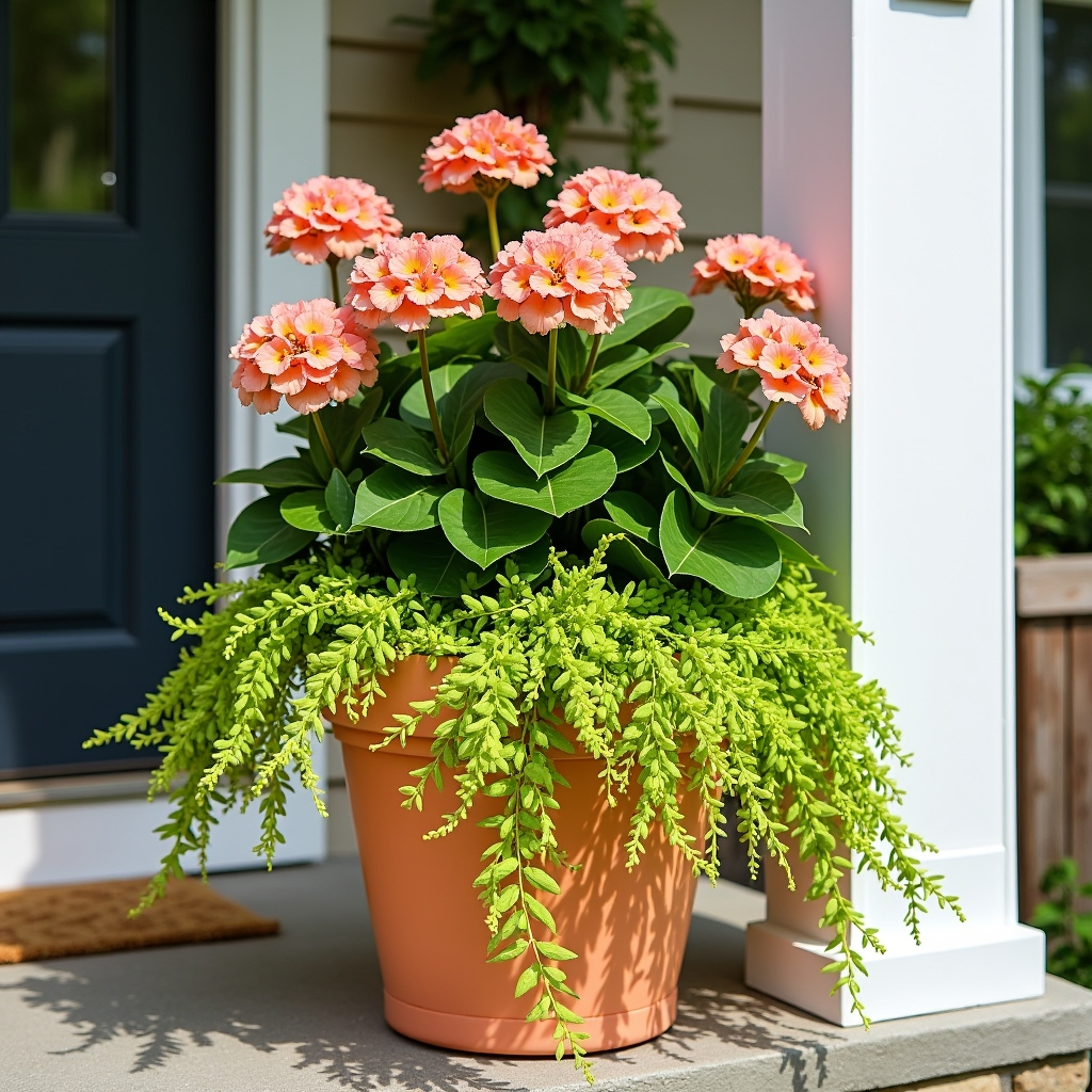 Bright, tropical plants like peach-colored lantana and neon green Creeping Jenny bring energy and vibrancy to your porch. Mix in trailing vines for a spilling effect and choose plants with complementary hues for balance. This tropical-inspired arrangement feels full, lively, and coordinated. Perfect for sunny, warm climates, it provides a colorful focal point that elevates the overall aesthetic of your front entry.