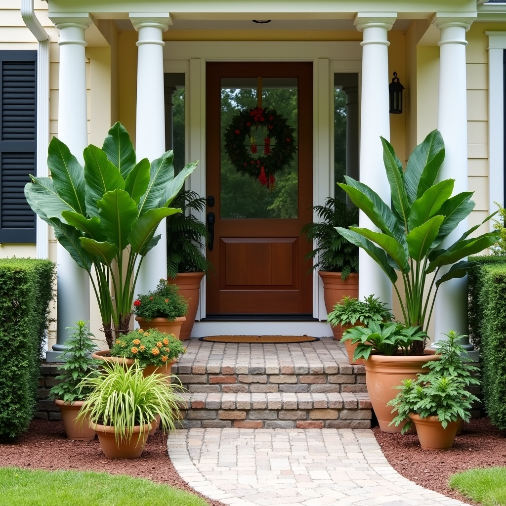 Anchor large potted tropical trees near the porch entry and fill the surrounding area with smaller pots. Mix leafy plants with flowering varieties to create depth, texture, and movement. This layered approach maximizes visual interest and makes every nook feel lush and intentional. Tropical planters thrive in humid, warm climates and bring a vacation-like energy to your front porch year-round.