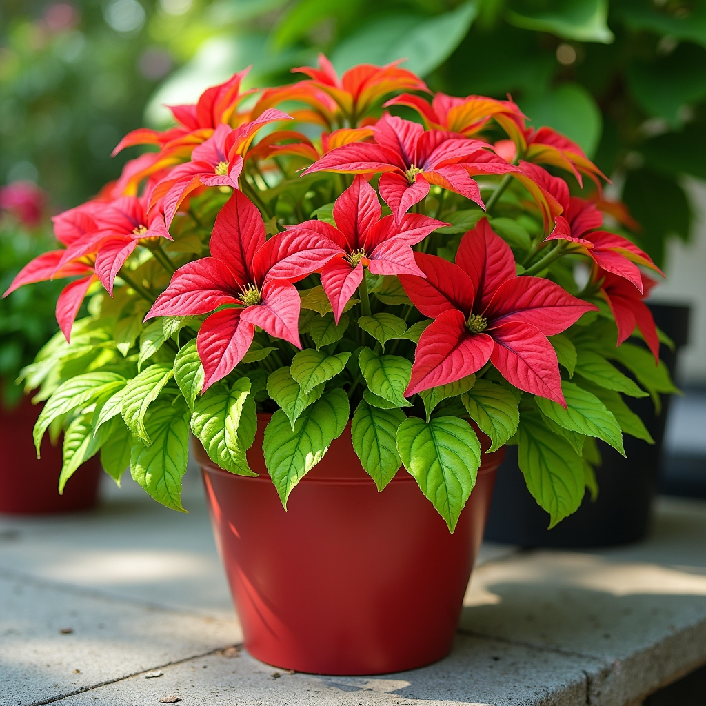 For high-impact visual appeal, pair vibrant reds with neon green foliage. Creeping vines and coleus add texture and trailing layers, while complementary flowers provide depth. This bold color combination makes a striking statement on a porch or patio, drawing the eye instantly. Perfect for sunny areas, this arrangement balances brightness with rich tones for a lively, energetic display.