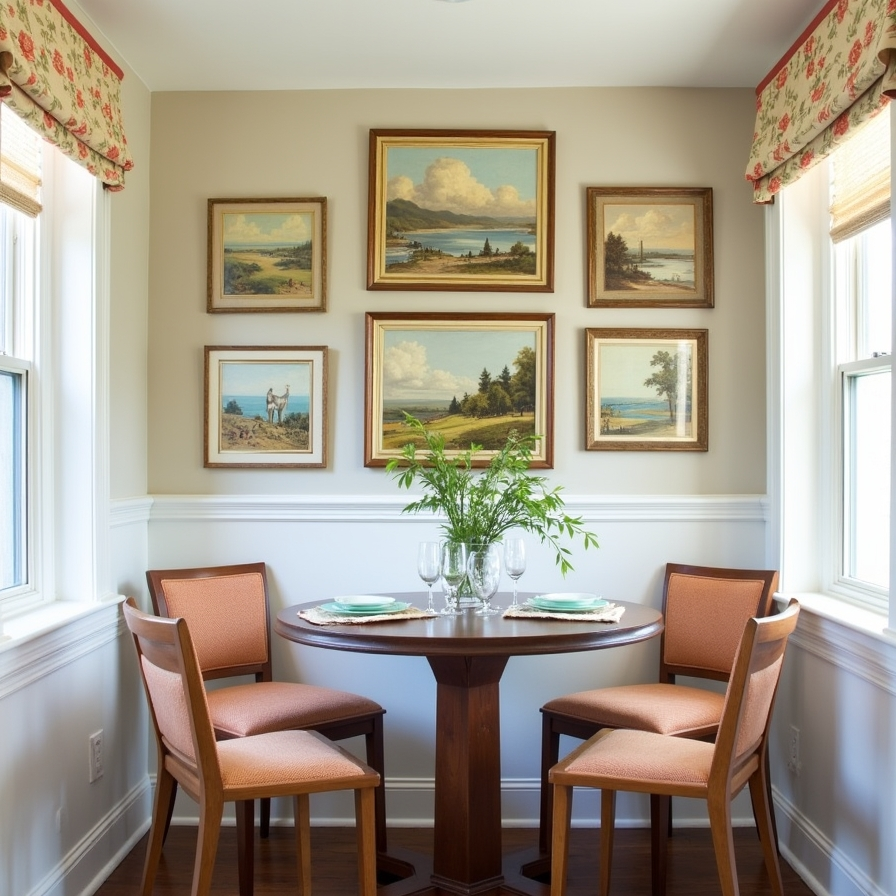 A gallery wall in a breakfast nook can make the space feel more inviting and full of character. Choosing vintage landscape paintings or themed artwork creates a cohesive and charming look. Placing a standout piece in the center helps anchor the arrangement while smaller pieces surround it. This design approach enhances the dining experience by adding warmth and personality to an otherwise simple area.